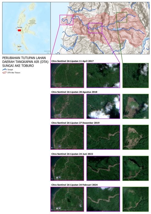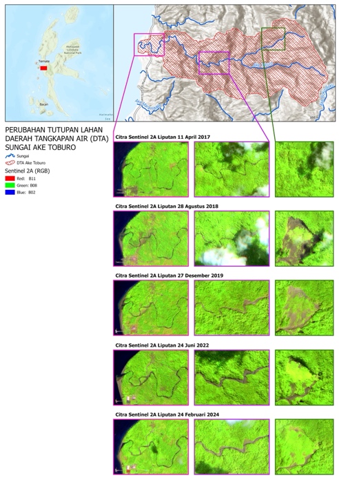 Setelah kembali dari Maluku Utara, saya bersama tim Bhumi Pasa Hijau melanjutkan analisis spasial secara lebih mendalam dengan memanfaatkan data penginderaan jauh multitemporal, khususnya citra Sentinel-2A. Hasil analisis perubahan tutupan lahan menunjukkan dinamika yang signifikan. Pada tahun 2017, wilayah hulu Sungai Ake Toburo masih didominasi oleh vegetasi rapat yang berfungsi optimal dalam menahan air hujan dan mengurangi aliran permukaan. Kondisi ini tercermin dari visualisasi citra yang masih homogen berwarna hijau.